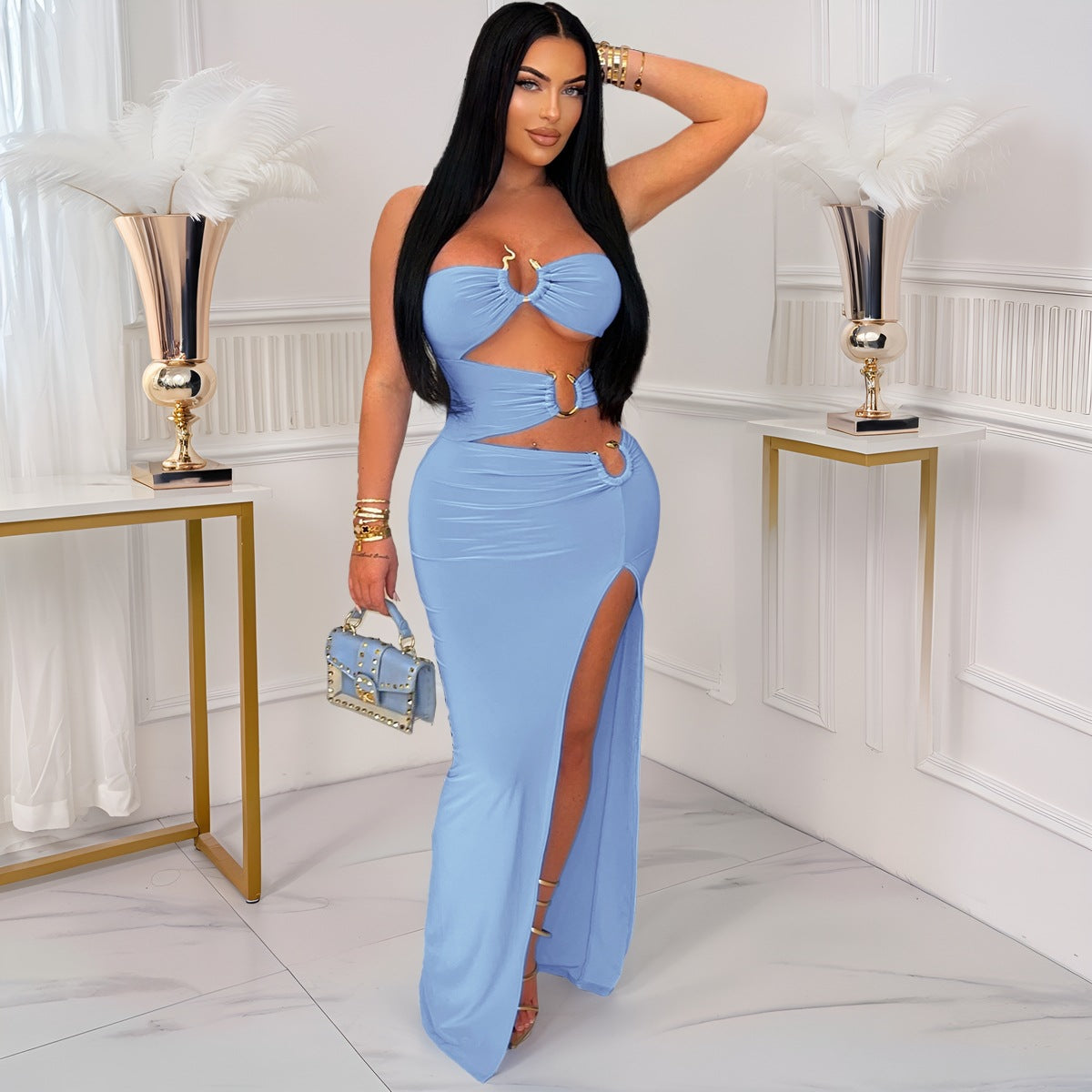 Turn heads in this striking bodycon dress, designed to make a bold statement. Featuring strategic hollow-out metal ring details and a sleek, form-fitting silhouette, this long dress hugs your curves while offering eye-catching style. The metallic accents catch the light beautifully, adding an edgy glamour to your evening look. Perfect for nights out when you want to feel confident and unforgettable.